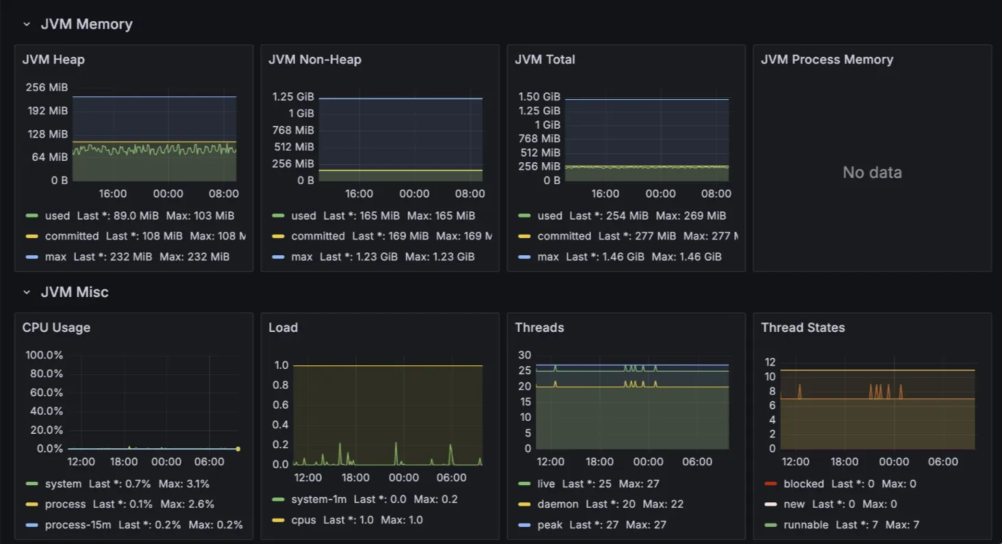 - JVM Heap/Non-Heap 메모리: 충분히 여유 있음